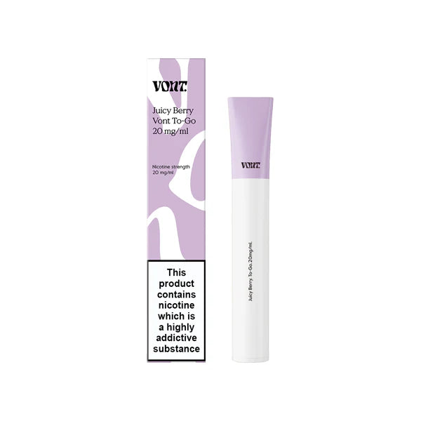 With multiple flavours to choose from that each deliver 20mg nicotine strength that are each powered by a built-in 280mAh battery, the Vont To-Go Disposable Device will last up to around 600 puffs which is the equivalent of more than three packs of traditional cigarettes. Each flavour is loaded with 2ml of Vont's developed in-house e-liquid formula based on nicotine salts. Please note that the nicotine content in each Vont To-Go Disposable may decrease over a longer period of time.