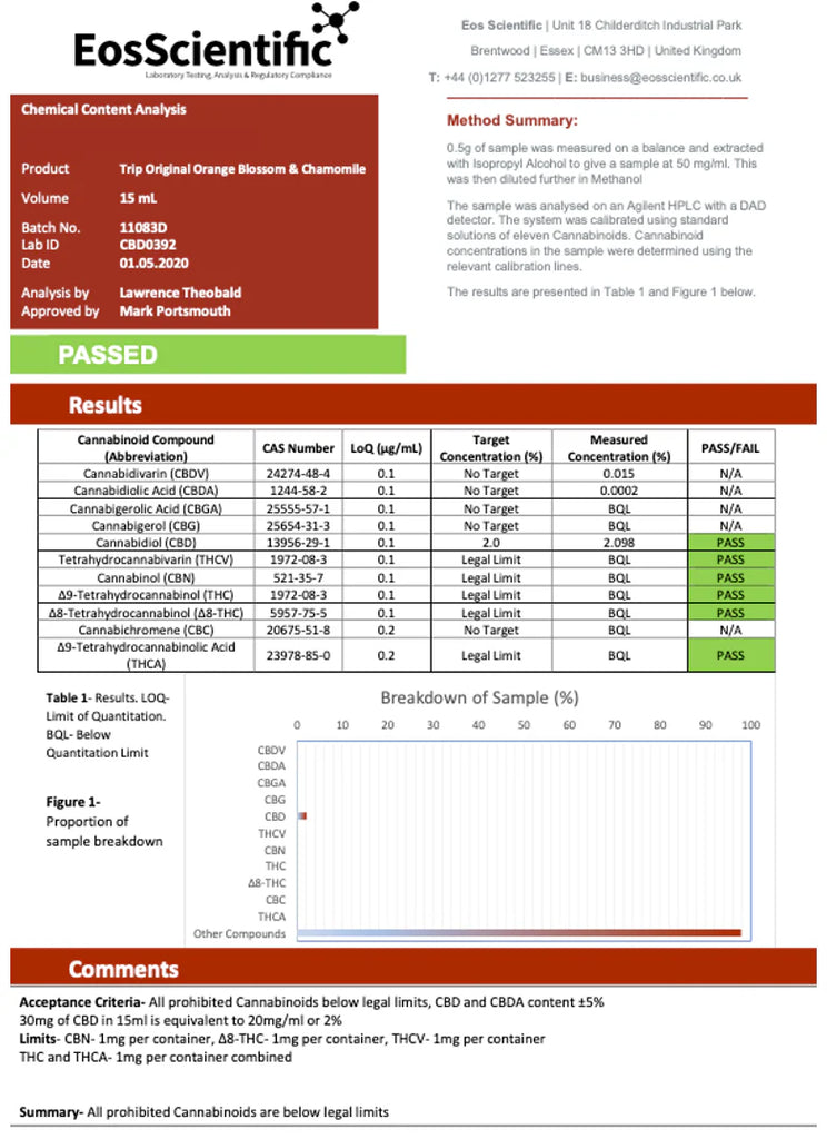 Ingredients: Water, fruit juices from concentrate (lemon 7%, grape), botanical extracts (lemon balm, ginseng, L-theanine, chamomile, rooiboos, basil 0.1%), natural sweeteners (erythritol, steviol glycosides), CBD (15mg), citric acid. May contain traces of soya lecithin. THC<0.2%