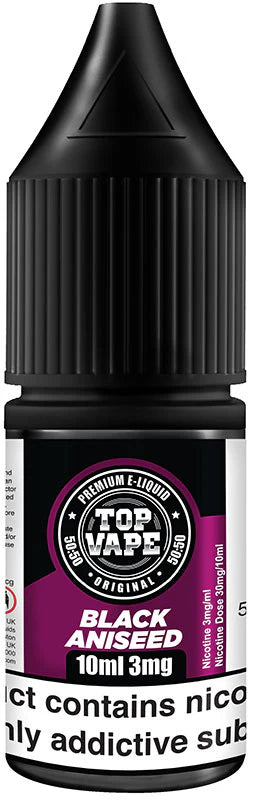 Top Vape - 50/50 - Black Aniseed - Fresh eucalyptus leaves combined with aniseed and menthol.Bottle Size: 10mlStrength: 18mg