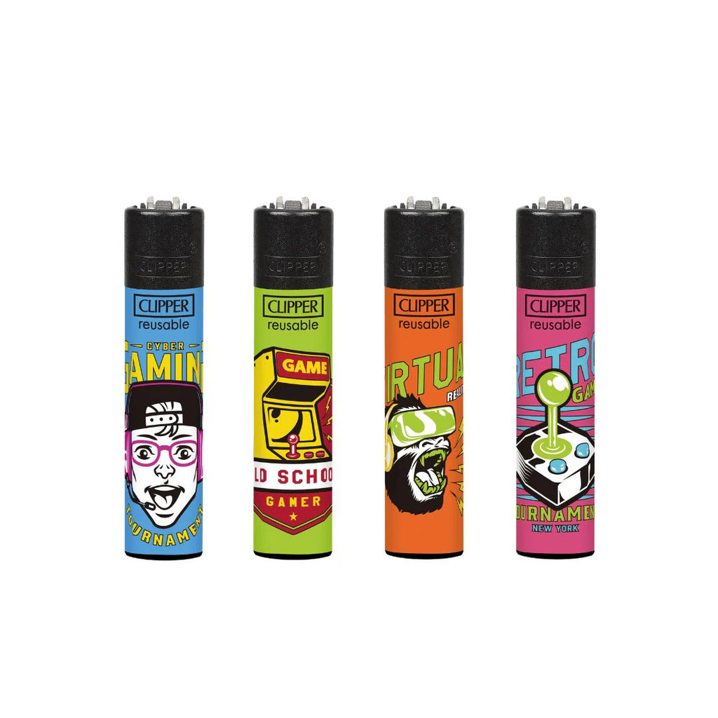 - 40 per pack Branded Lighters- Clipper Micro Refillable Lighters- 4 Assorted Designs- Preset Flame- Gas Lighter