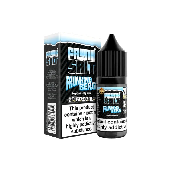 As a range of balanced 50VG/50PG e-liquids, these 10ml Frunk Salts Nic Salts are ideally suited Mouth To Lung (MTL) vaping devices, pods and kits. Once you start inhaling your chosen flavour, the nicotine intake will be delivered faster and will last much longer than with other e-liquids. In addition, the level of satisfaction is much higher than with traditional e-liquids as these Nic Salts come with minimal throat irritation as you inhale your chosen Frunk Salt flavour.