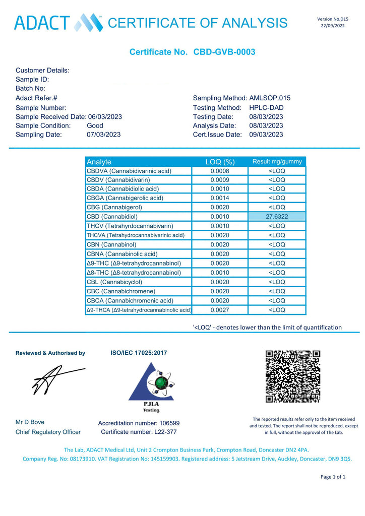 Ingredients: Cannabis Sativa L (Broad Spectrum, Sugar, Glucose syrup, Wheat starch, Water, Modified maize, Acids (lactic, Malic, Citric), Flavouring, Fruit and vegetable Concentrates (Black carrot Spirulina, Safflower), Vegetable Oil (Coconut), Glazing Agent (Carnauba wax). Carrier Oil: MCT Oil