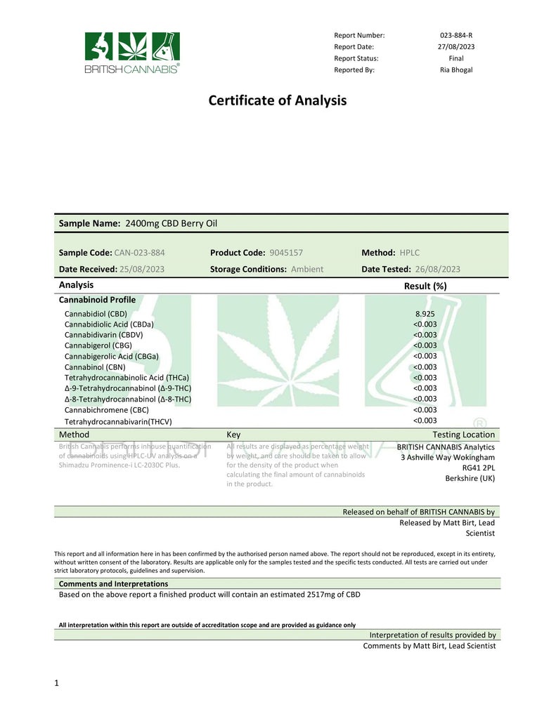 Ingredients: Natural hemp-extracted CBD, MCT Coconut Oil, Natural Berry Flavourings.