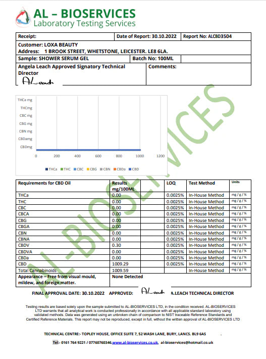 Loxa Beauty' shower serum in gel form, specially formulated to enrich your skin with vitamin E, omega fatty acids which balances your skin and locks in moistue. Infused with a generous 1000mg of CBD, this unique serum nourishes and hydrates the skin, leaving it feeling refreshed and rejuvenated after each use. Treat yourself to the ultimate self-care ritual with Loxa Beauty's CBD-infused shower serum and indulge in a moment of pure bliss.